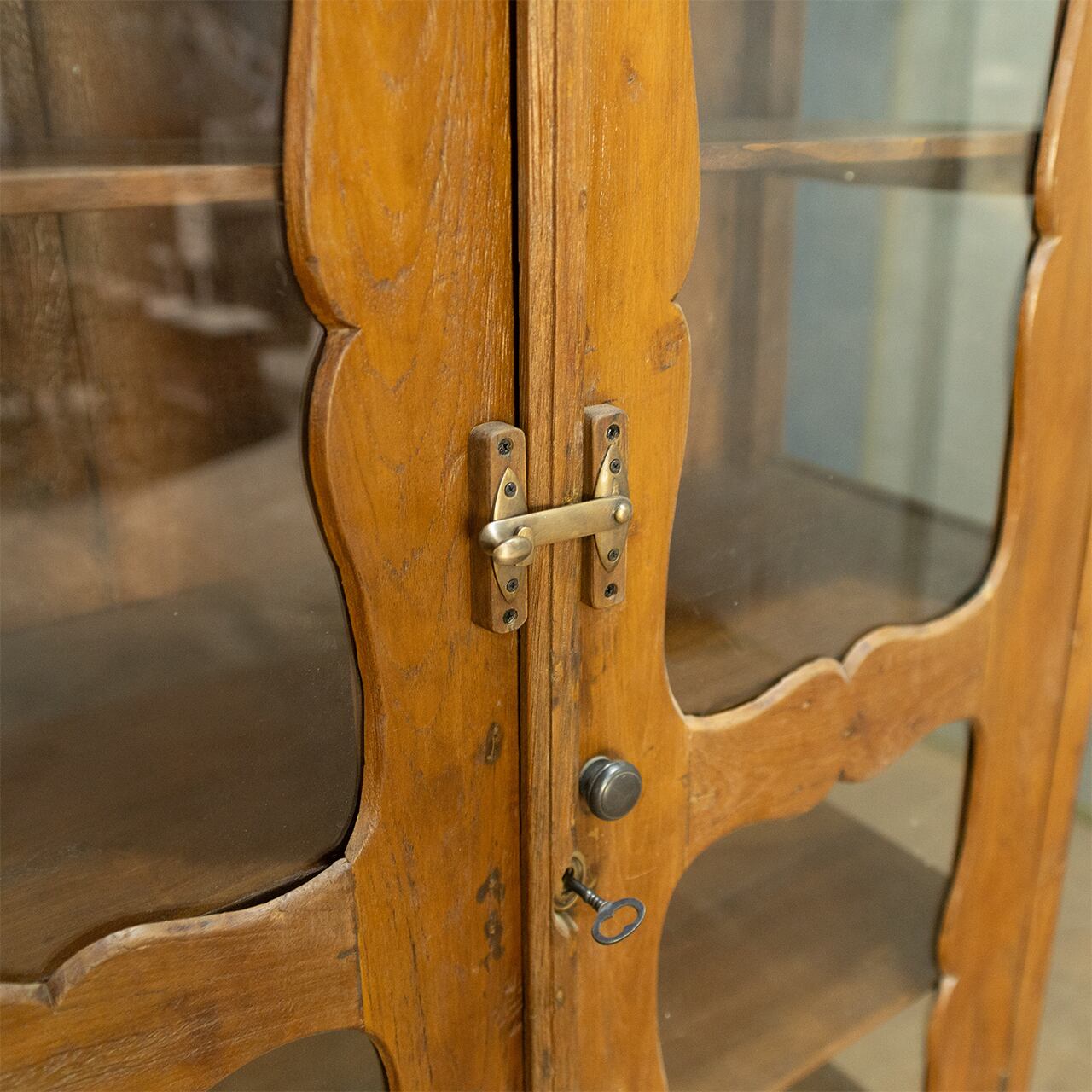 前面のガラス扉には、アールデコの影響を受けた美しい曲線デザインが施されており、天板や脚部の幕板にも当時の職人の手仕事が随所に感じられます。